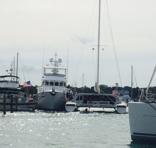 image ← Previous Next → Catamaran whose mooring broke free and caused the boat to drift into the side of the Nordhaven with a loud crunch. Ouch!