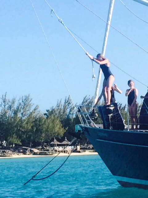 Group of spring break college girls swinging from the halyard. Fun!