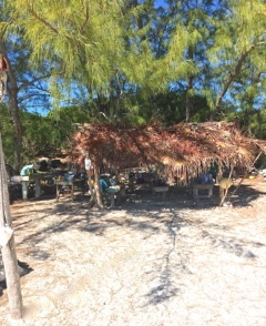 Thatched roof shade with sturdy wooden benches for seating