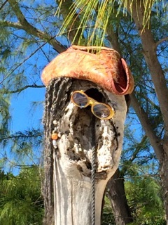 Johnny Depp look alike made out of a dead palm tree and donated pirate gear