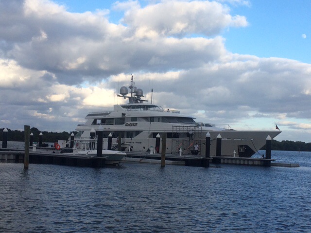 Seriously, as we made our way through the tight entrance to the marina, which is tucked way back up in the cove, Tom made sure Southern Trawl came to within a only a couple of feet of any of these incredible vessels who call Palm Beach their home port. Piloting with twin screws helps, but maneuvering  the turns and curves with high winds blowing and strong current running, without the benefit of bow or stern thrusters,  was a white knuckle experience, even for a seasoned Captain! I had been piloting the last mile or two, but quickly gave up the helm when the going got tough.