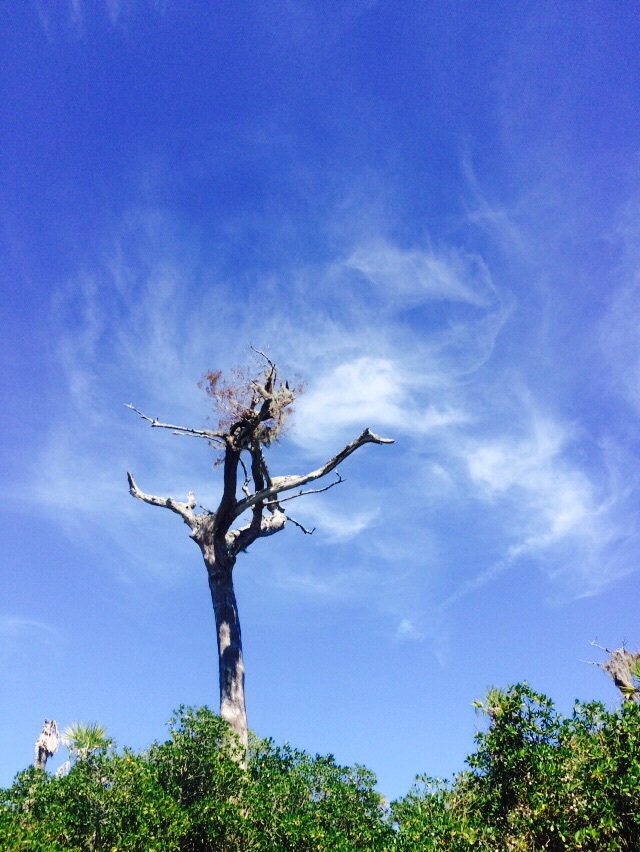 We decided to make a short run and anchor out in Mosquito Lagoon which is a huge bay, just off the waterway. It’s only about 5-7 ‘ deep and there were at least 50 crab pots spread out in a circle. We hoped the crabberman would come along before we left, so we could buy dinner from him. He never showed, but we did discover lots of needle fish in the shadow of our boat next morning. They are fun to watch. They hover quietly until spooked , then they flip their bodies creating a flash of light and then they’re gone.