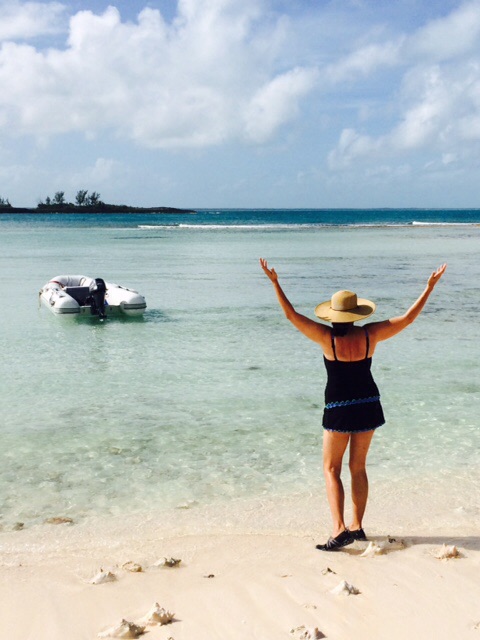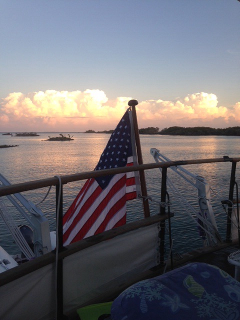 Saturday afternoon we arrived at Mangrove Cay, without another boat in sight.  After enjoying  a leisurely dinner, I took a cushion, light blanket, and glass of wine up onto the bow, and relaxed into the rythum of the peaceful sea. I sat staring up into the  star studded sky, listening to the gentle lap of the waves on the side of the boat, and the faint sound of klinking plates and glasses as Tom finished washing up the last of the dinner dishes. BLESS HIS SWEET LITTLE HEART !!!