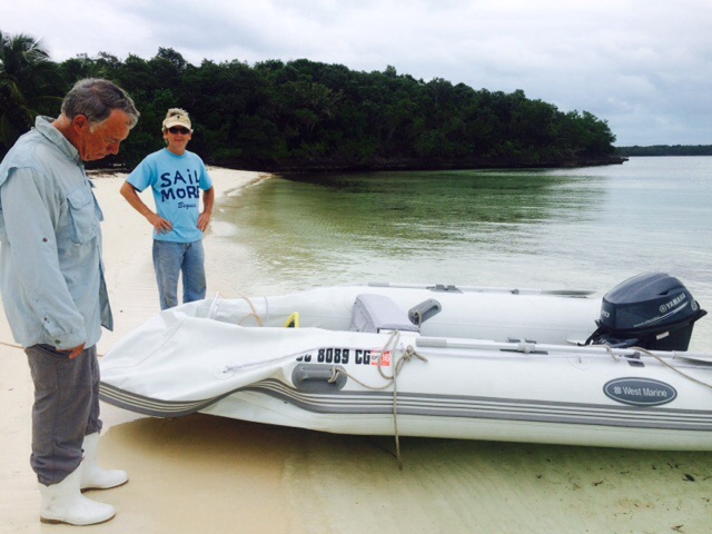 After our scary experience of being pushed up against the rock bank during the storm 2 nights before, we were delighted that the mangrove bushes cushioned our vessel, and it appears the only damage we sustained was a small puncture in one of our porthole screens and a small tear in our side deck skirting. The dinghy got a bit of chaffing during our rough ride over to Manjack, but Bill helped Tom put it right.